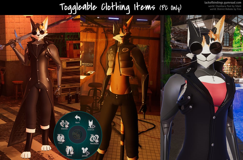 - 5 Toggleable clothing items (Glasses, Coat, Jacket, Pants, Necklace) (PC Only)