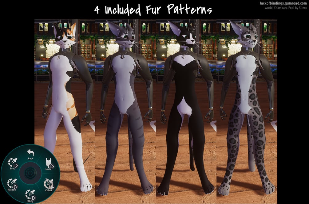 - 4 Preset fur patterns with and without bodysuit.