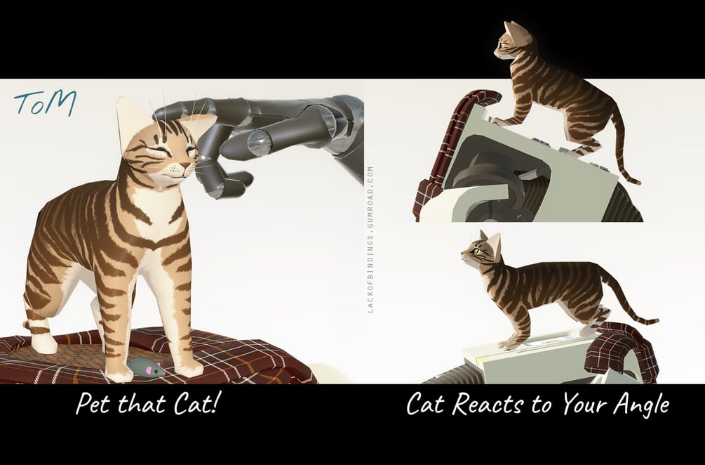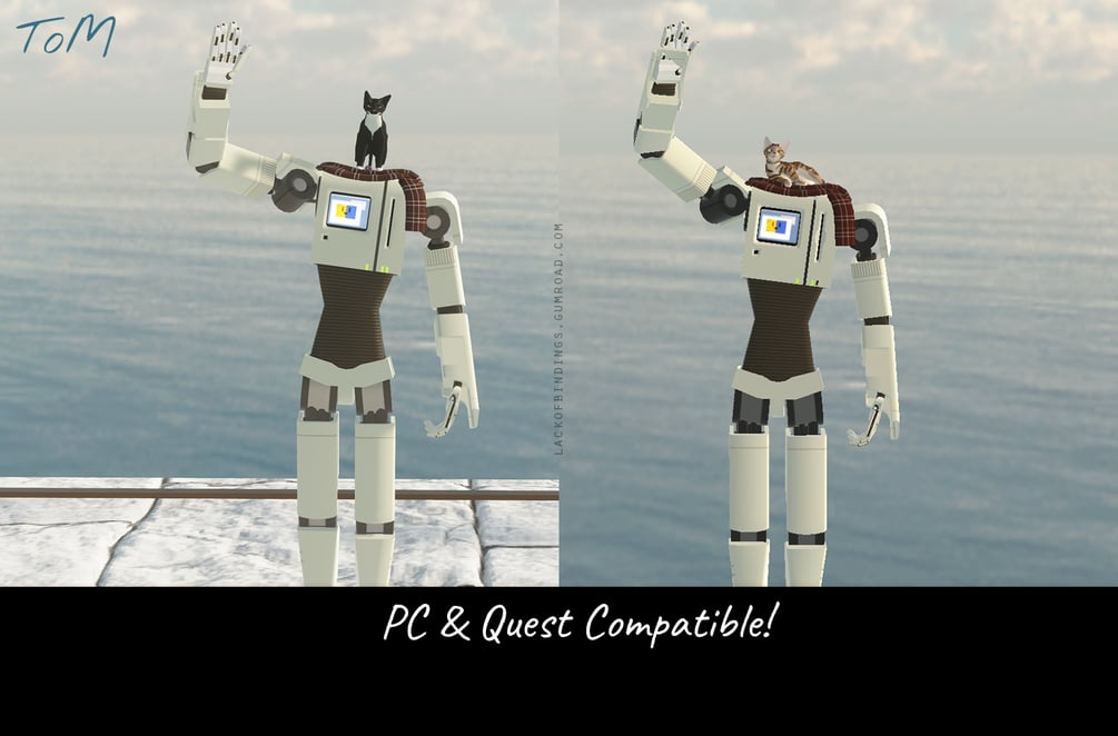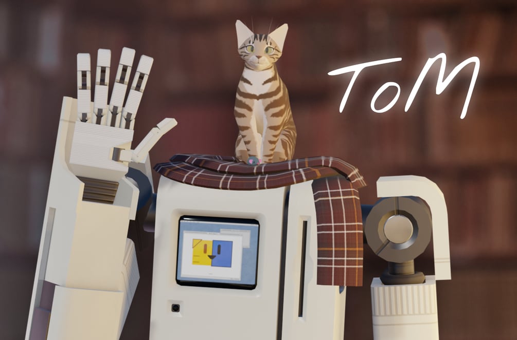 "Tabby-on-Machine. ToM doesn't talk much, but his kitty friend more than makes up for that in personality."