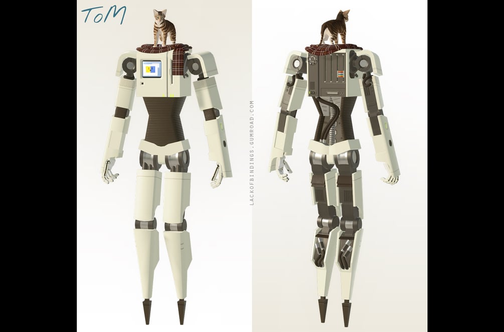 "Tabby-on-Machine. ToM doesn't talk much, but his kitty friend more than makes up for that in personality."